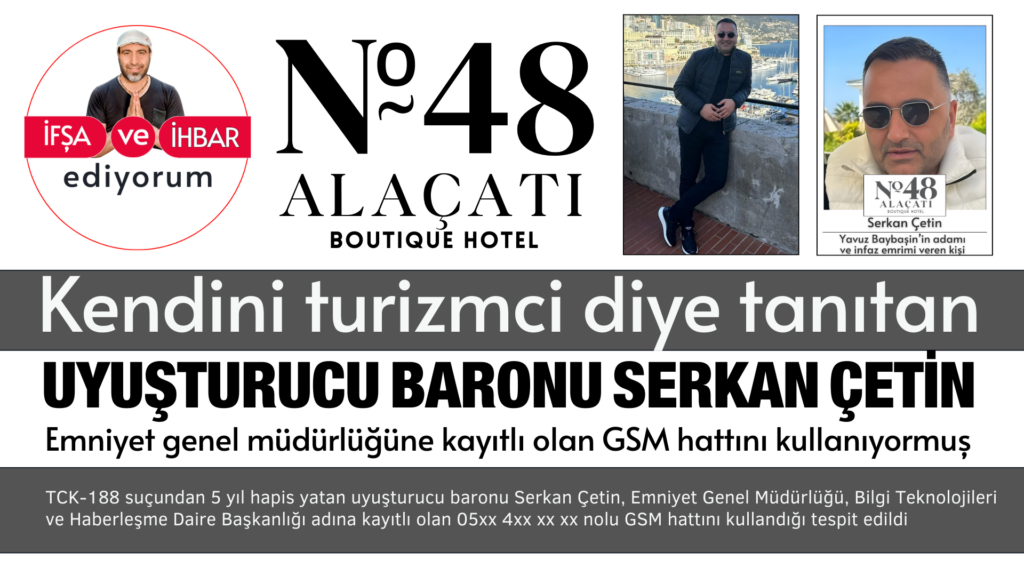 Kendini suç aleminde kamufle etmek isteyen Serkan Çetin İzmir ALAÇATI’da bulunan No 48 ALAÇATI BOUTIQUE HOTEL adlı işletmeyi çalıştırdığı bilinmektedir.